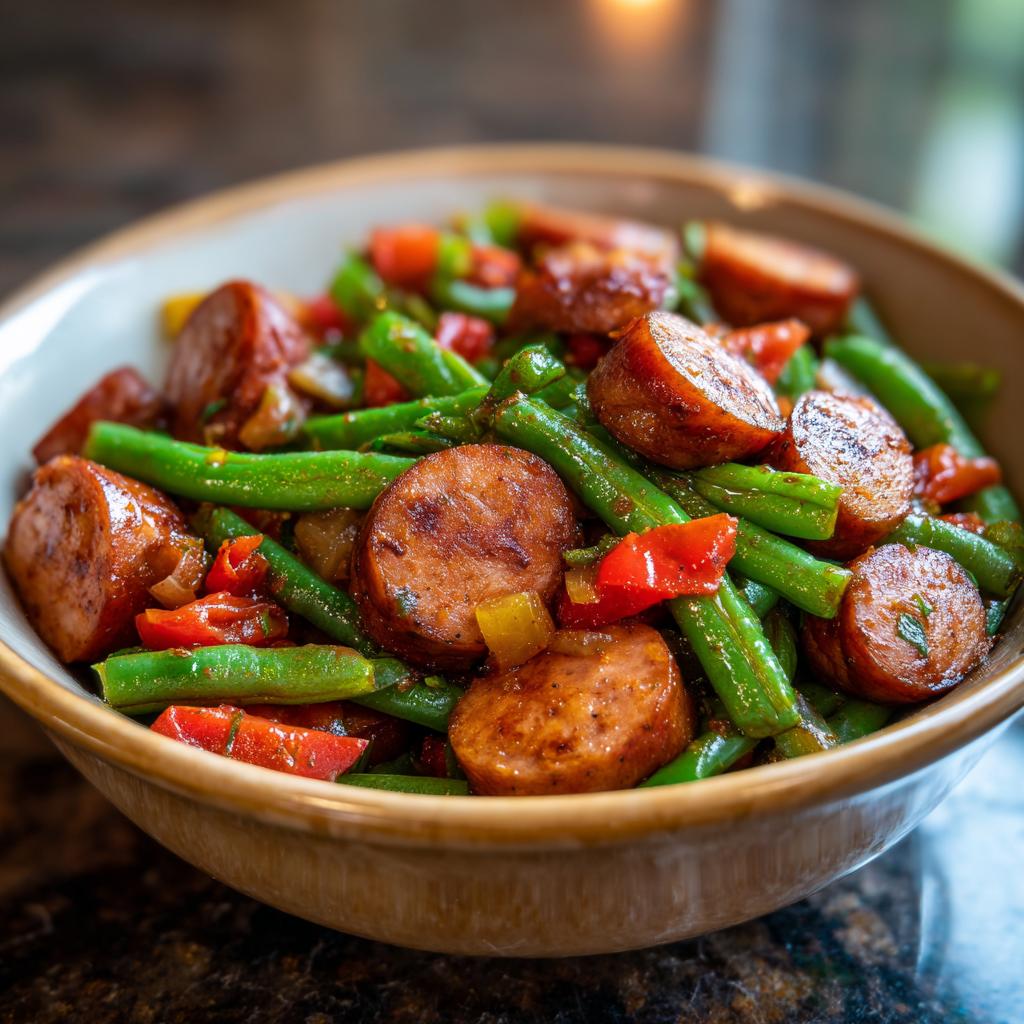 This recipe combines kielbasa sausage and fresh green beans in a slow cooker for an easy and flavorful meal.
